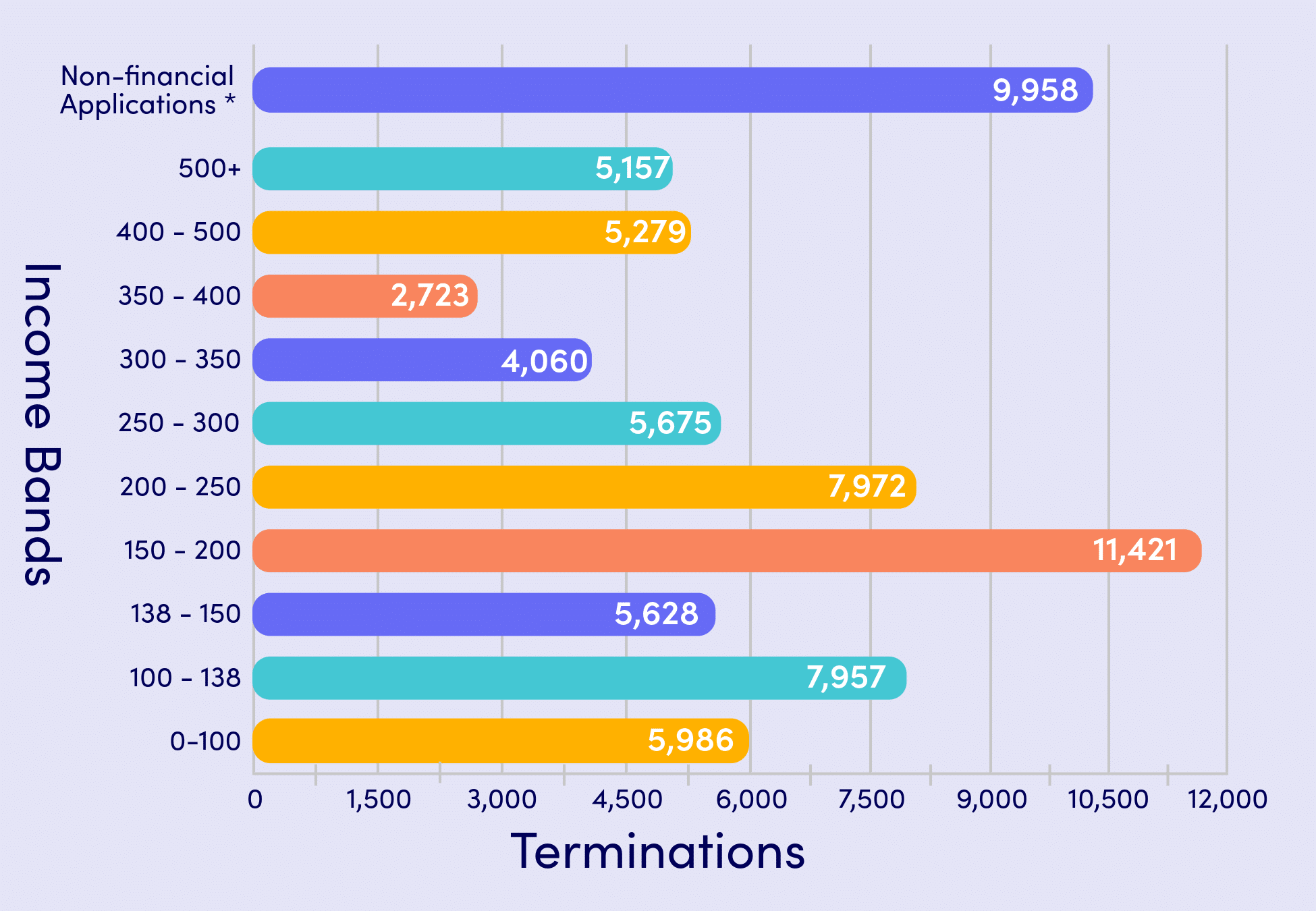 - The highest level of terminations by income have been in the 150-200% Federal Poverty Level (FPL) range, $23,475 to $31,300 for a single adult.
